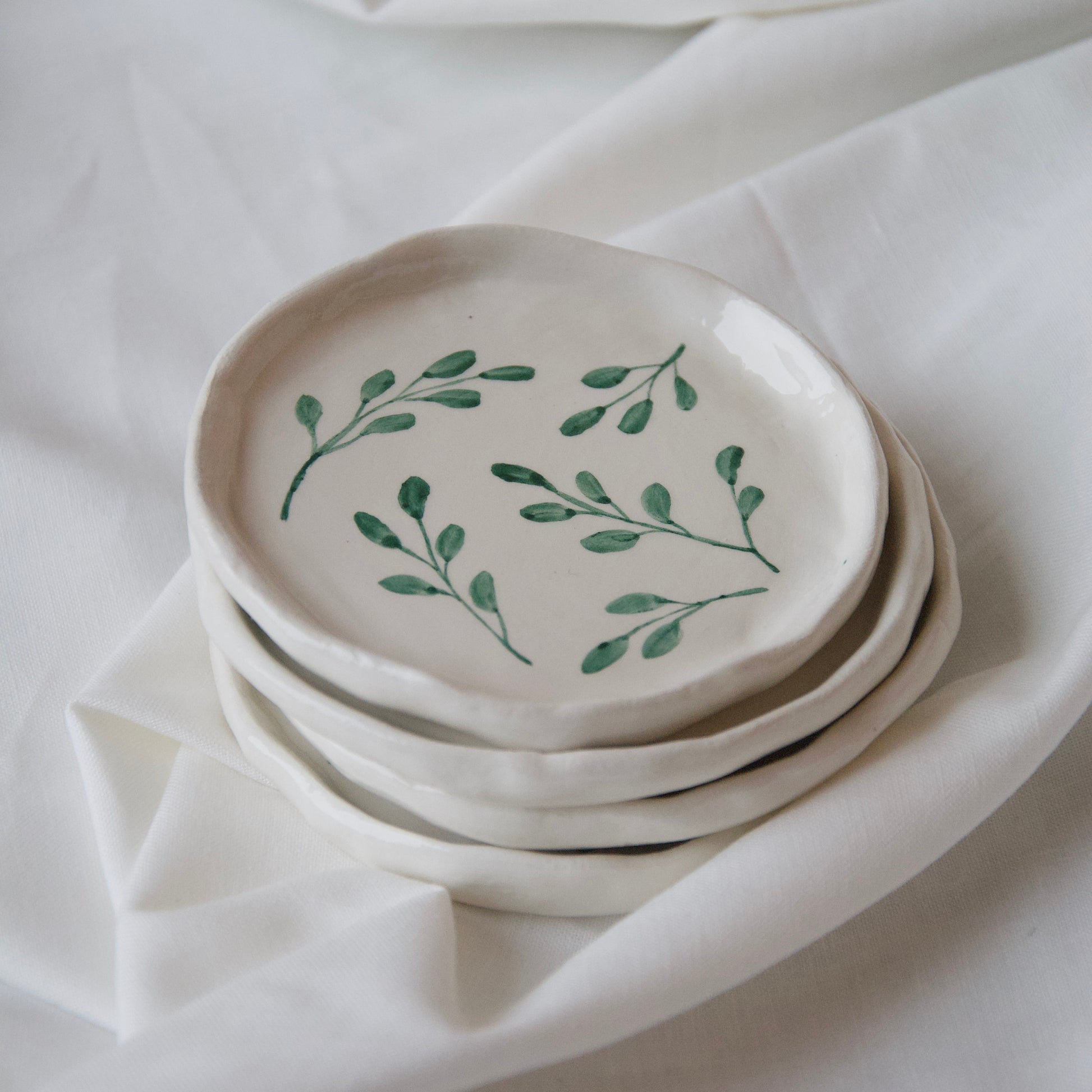 Questi piattini sono interamente modellati e dipinti a mano, con una decorazione botanica a foglioline verdi su uno sfondo di argilla bianca dal colore bianco panna.