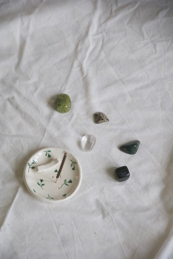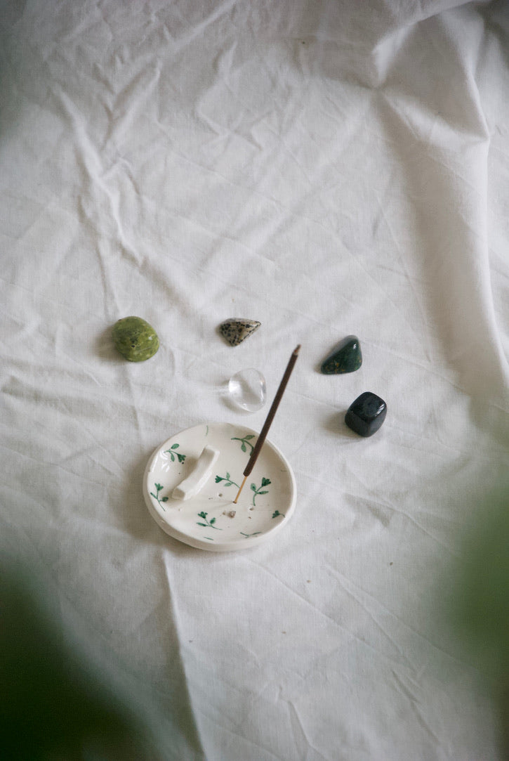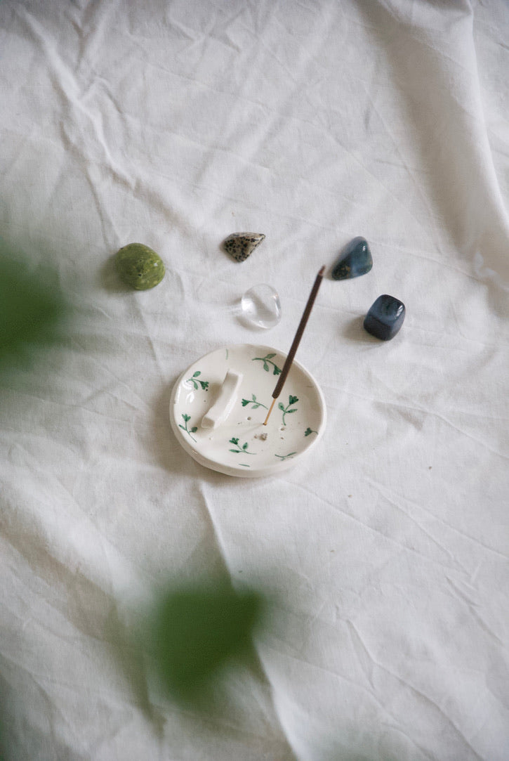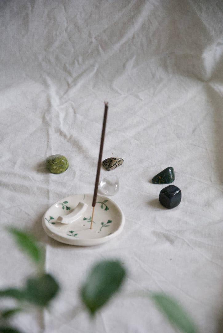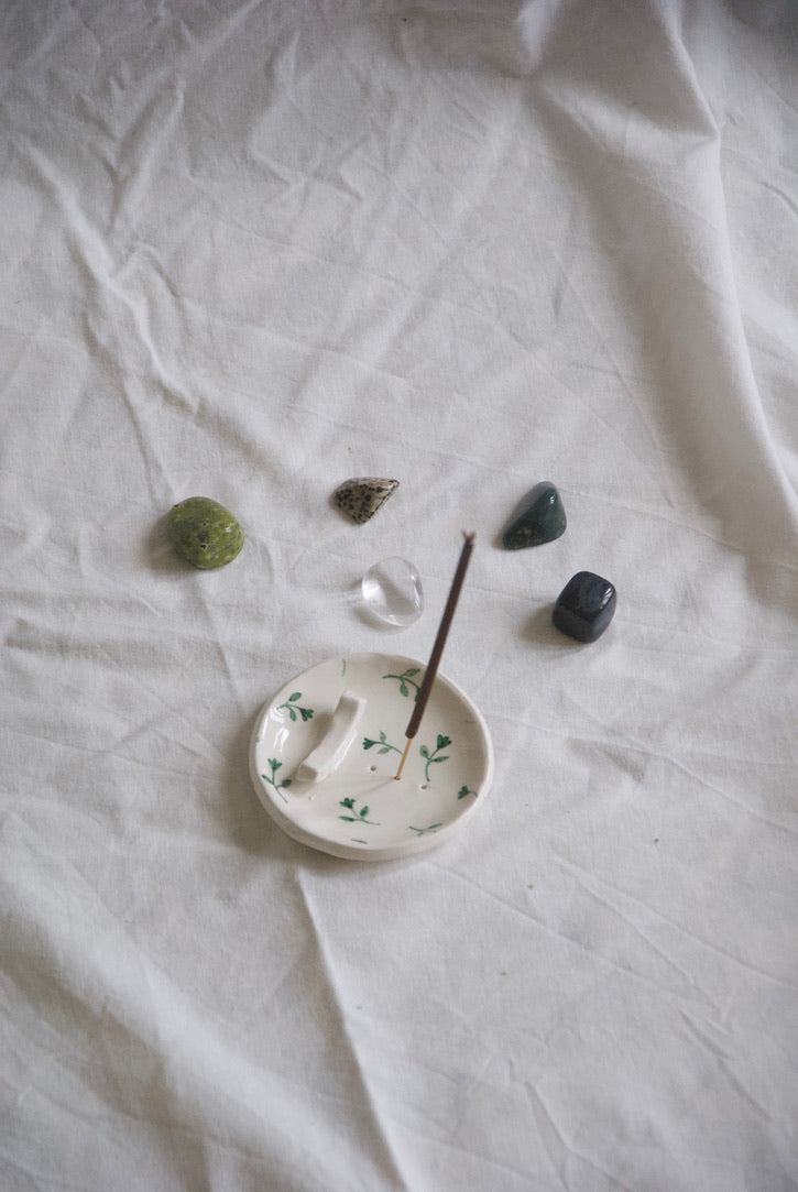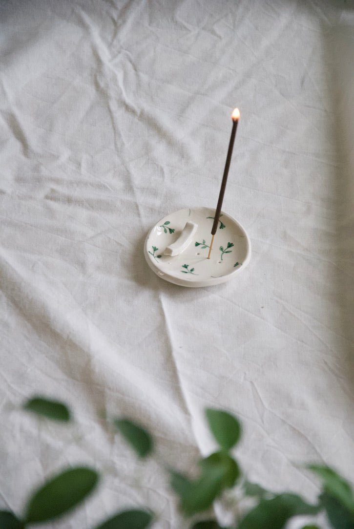 Questi porta incenso sono interamente modellati e dipinti a mano. Sono realizzati in ceramica bianca, e decorati con piccoli fiorellini verdi. il piattino è pensato per essere usato come base per diversi dipi di incenso. Ha infatti un piccolo supporto sul quale appoggiare i legnetti di incenso (tipo palo santo), tre buchini in cui inserire gli incensi “a bastoncino”, e uno spazio in cui bruciare gli incensi a forma conica.